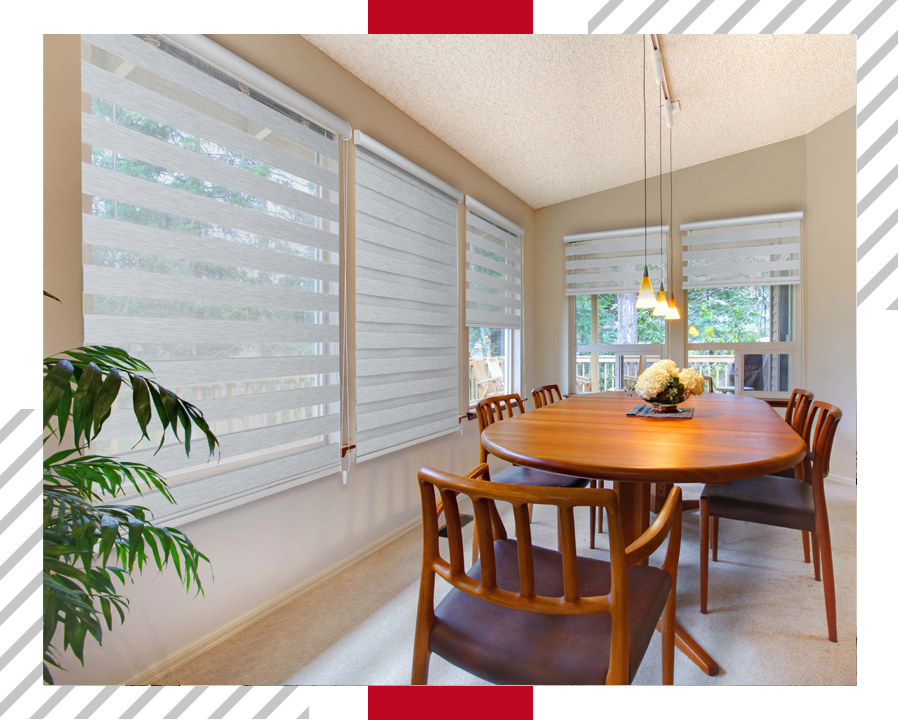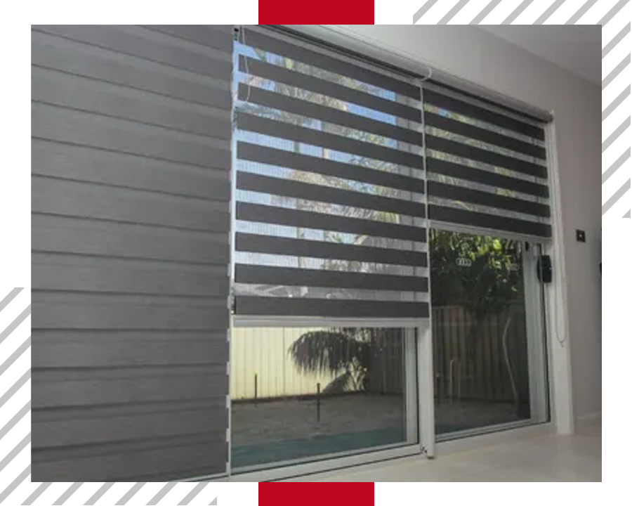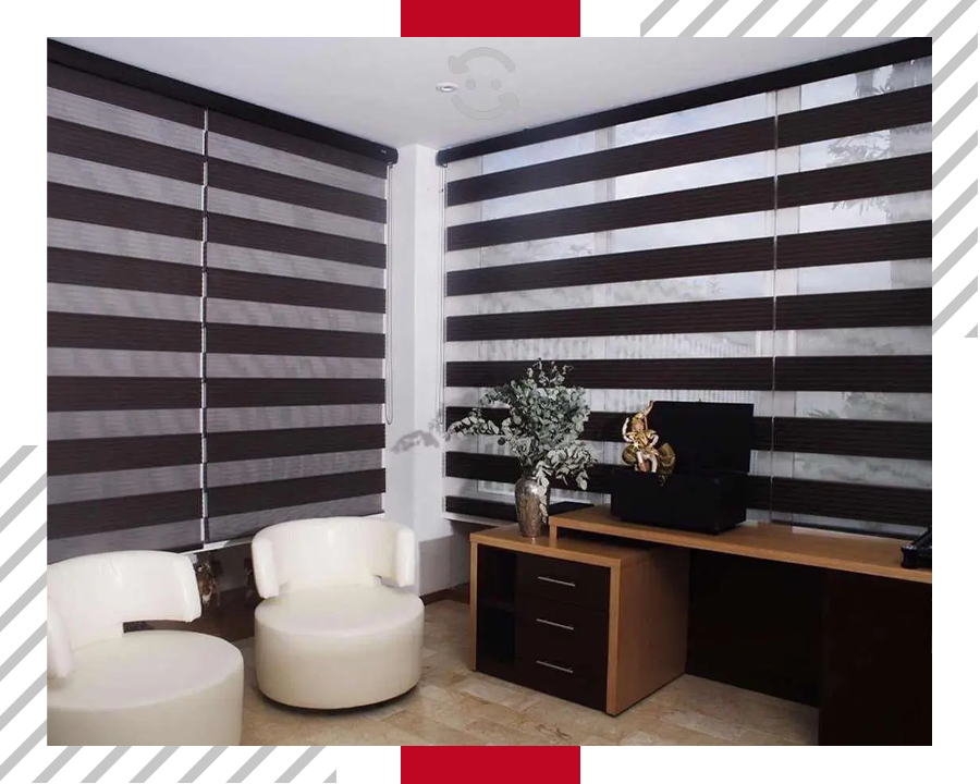 Se compone de 2 persianas: la primera es un tejido traslúcido o malla solar (utilizado durante el día) y la segunda es un tejido blackout usada mayormente en noche o SALA juntas.